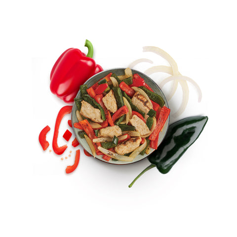 Yellow Onion, Bell Pepper, Poblano Pepper, All Natural* Fully Cooked Seasoned Flame Broiled Chicken Breast Strips (Boneless Skinless Chicken Breast Meat, Water, Seasoning [Potato Starch, Yeast Extract, Salt, Onion Powder, Garlic Powder, Spices, Citrus Extract]), Extra Virgin Olive Oil, Cilantro, Garlic Powder, Onion Powder, Sea Salt, Lemon Juice concentrate, Himalayan Pink Salt, Cumin, Lime Juice Concentrate, Chili Powder, Paprika, Black Pepper. *minimally processed, no artificial ingredients.