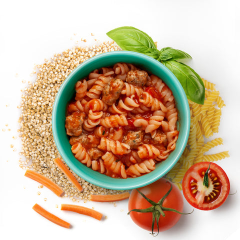 Andean Fusilli Pasta (Rice and Quinoa Flour), Tomatoes in Juice (Diced Tomatoes, Tomato Juice, Citric Acid, Calcium Chloride), Turkey Meatball (Turkey, Water, Salt, Spices, Garlic Powder, Onion Powder, Yeast Extract, Rosemary Extract, Citrus Extract), Yellow Onion, Tomato Paste, Carrots, Bell Pepper, Sea Salt, Yeast, Garlic, Basil