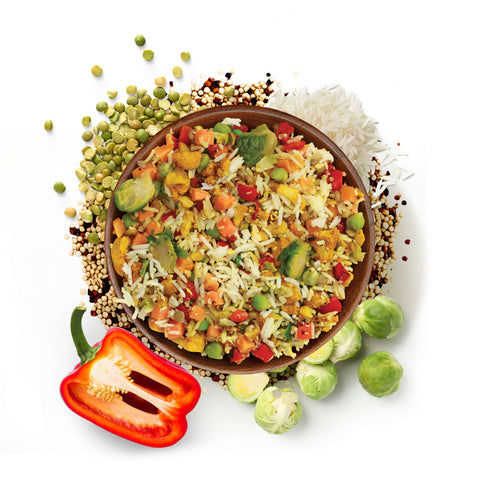 Cooked Basmati Rice, Roasted Cauliflower (Cauliflower, Masala Curry Powder [Spices, Turmeric, Salt, Onion, Garlic, Shallots, Sugar, Olive Oil, Smoke Flavor], Extra Virgin Olive Oil, Sea Salt), Cooked Green Garbanzo Beans, Brussels Sprouts, Lemon Mint Tahini Sauce (Water, Tahini Paste [Sesame Seeds], Lemon Juice Concentrate, Agave Syrup, Sea Salt, Garlic, Vinegar, Dijon Mustard [Distilled Vinegar, Water, Mustard Seed, Sea Salt, Turmeric, Spices], Mint, Black Pepper), Sweet Potato, Cooked Quinoa, Cooked Lentils, Red Bell Pepper, Dried Coconut.
