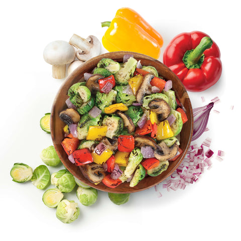 A blend of hearty, healthy, and savory fire-roasted vegetables featuring Brussels sprouts, mushrooms, yellow and red bell peppers, complemented by the savory notes of red onions.